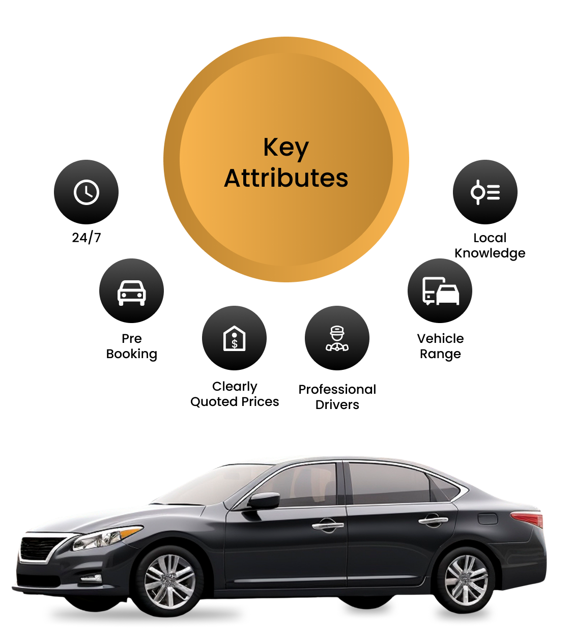 Vehicle range: Private hire saloons up to executive cars, spacious cars to suit large groups and families.